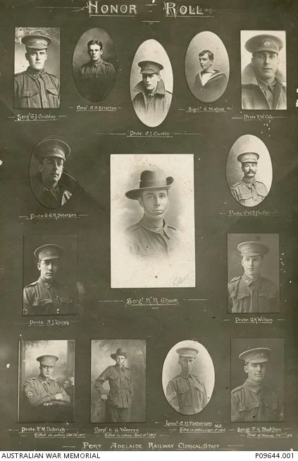 Honor Roll of the Port Adelaide, South Australia Railway clerical staff who served in the First World War. From left to right, top row: 12706 Private (Pte) Thomas Crichton MSM, 11th Field Ambulance from Alberton, South Australia; 3928 Corporal (Cpl) Allen Alfred Stratton, 10th Battalion from Malvern, South Australia; 2258 Pte Cornelius Joseph Curtin, 9th Light Horse Regiment from Exeter, South Australia; Signalman E. Moffatt (Navy); and 16223 Pte Richard Herbert Cole, Australian Army Pay Corps from St Peters, South Australia. Second row: 15456 Pte Theodroe Edward Reeves Petersen, 8th General Reinforcements from Alberton; 869 Sergeant (Sgt) Kenneth Robert Cheek, Australian Army Service Corps from Medindie, South Australia; and 18927 Pte Victor Walter Darke Pedler, 14th Australian General Hospital from Semaphore, South Australia. Third row: 9418 Pte Arthur John Lucas, No 3 Field Ambulance from Gilberton, South Australia; and 5374 Pte George Kenneth Wilson, 15th Field Ambulance from North Adelaide, South Australia. Bottom row: 6423 Pte Frank Martin Dubricich, 4th Field Ambulance from Portland, South Australia (killed in action on 20 October 1917 near Ypres, Belgium.); 1385 Cpl Urban Guy Warren, 48th Battalion from Norwood, South Australia (killed in action on 11 April 1917 at Bullecourt, France); Second Lieutenant Cecil Norman Patterson, 43rd Battalion from St Peters, South Australia (killed in action on 1 September 1918 near Mont St Quentin, France) and 4351 Sgt Perrin Hamilton Blackham, s27th Battalion from Sempahore, South Australia (died on 7 November 1916 of wounds received at Dernancourt, France.)