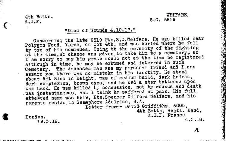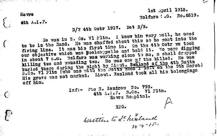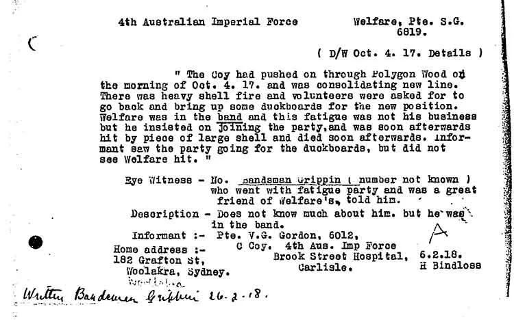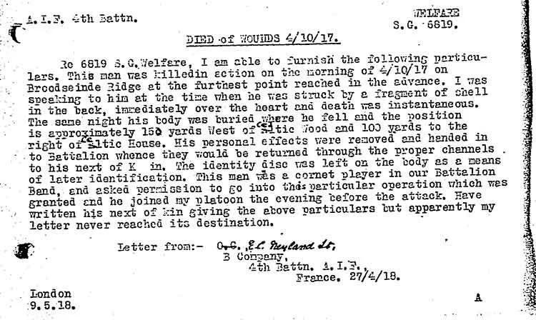 According to his Red Cross Wounded and Missing Bureau file, Pte Welfare was a member of the battalion band and was in the line for the first time, assisting in bringing up duckboards to consolidate the ground gained during the Battle of Broodseinde Ridge on 4 October 1917. He was hit by fragments of a German shell and died moments later, aged 28.