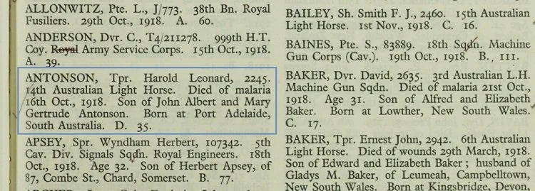 Trooper Harold Leonard Antonson entry in the Commonwealth War Graves Commission Record of War Dead, Index No. 2 Syria , Damascus Commonwealth War Cemetery, page 27.
