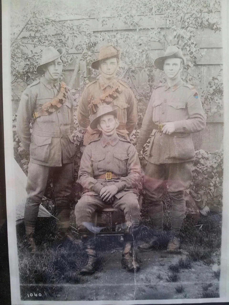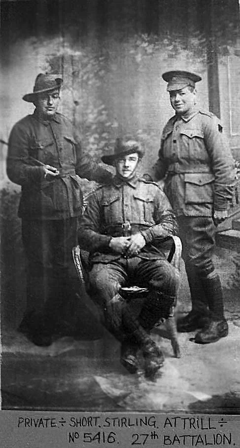 Private Short Stirling Attrill 5416 (sitting center) a Police Constable from Port Adelaide, South Australia prior to Enlistment on 22 May 1916, He embarked with the 27th Battalion, 14th Reinforcement from Adelaide, South Australia, on board HMAT A70 Ballarat on 12 August 1916.
