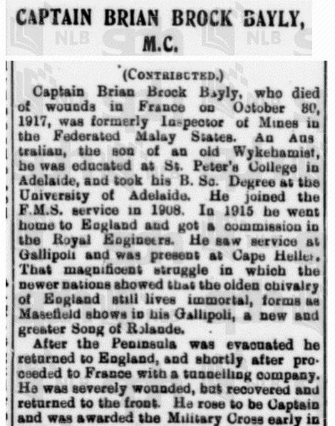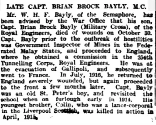 Mr. W. H. F. Bayly, of the Semaphore, has been advised by the War Office that his son, Capt. Brian Brock Bayly (Military Cross), of the Capt. Bayly prior to the outbreak of hostilities Royal Engineers, died of wounds on October 30. was Government Inspector of Mines in the Federated Malay States, and proceeded to England, England severely wounded, but again proceeded where he obtained a commission in the 254th Tunnelling Corps, Royal Engineers. He was at the evacuation of Gallipoli and subsequently went to France. In July, 1916, he returned to to the front a few months later. Capt. Bayly was an old St. Peter's boy, and revisited the school when on furlough early in 1914. His youngest brother, Colin, who was a lance-corporal in the Liverpool Scottish, was killed in action in April, 1915”.The Mail 10 November 1917