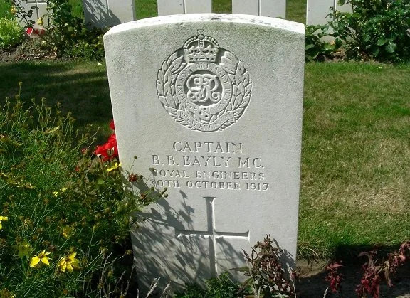 Captain Brian Bayly MC was buried in Nine Elms British Cemetery in Poperinghe, Belgium: Plot VI, Row A, grave 11.