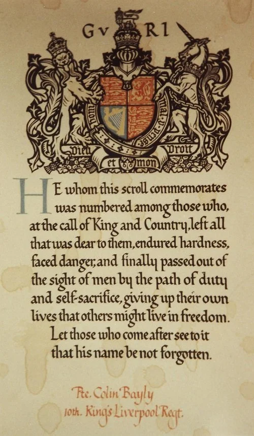 This is the Commemorative Scroll which was issued to William Bayly in about 1922 in commemoration of his son Lance-Corporal Colin Bayly of the 10th (Scottish) Battalion, The King’s (Liverpool Regiment) who was killed-in-action in Belgium in 1915.