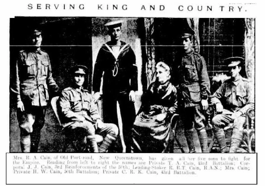 | Next of kin | Mother, Mrs Rose Amelia Cain, Old Port Road, New Queenstown, Port Adelaide, South Australia |