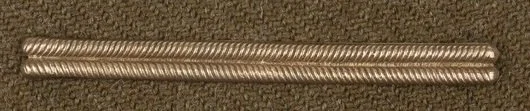 This was a strip of narrow gold Russia braid, two inches in length, worn perpendicularly on the left sleeve of the jacket to mark each occasion a soldier was wounded badly enough to be evacuated from the front line.