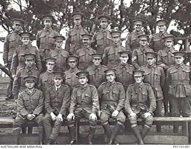 Group portrait of officers and non-commissioned officers of 8th Reinforcements of the 10th, 12th and 16th Battalions, at Mitcham camp (later Colonel Light Gardens), Adelaide, South Australia. Identified from left to right: back row: 2568 Corporal (Cpl) Leslie Gordon Shannon from Bagot's Well, South Australia (later Lieutenant (Lt) and awarded DCM); 2709 Pte Leslie George William Caust from Somerton, South Australia (later Lt); 2567 Cpl Alan Kenmore Brooker, from Kent Town, South Australia; Cpl Mac...(unidentified), 2608 Cpl Roy Reginald Foulkes from Gilles Plains, South Australia (later Sergeant); and 2631 Cpl Douglas Bertram Bert Crisp from Rosewater, South Australia. Second row from back: 2606 Sergeant (Sgt) James Finlay from Hyde Park, South Australia; 2559 Sgt David Jesse Henry Millard from Port Pirie South Australia; 2603 Cpl George Evans from Stepney, South Australia; 914 Sgt Leonard Charles Gardner from Murray Bridge, South Australia (later Company Quartermaster Sergeant); 2593 Sgt James Eric Mayne from North Adelaide (later Company Sergeant Major); and 2664 Sgt Samuel (Sammy) Aynsworth Osborne from Prospect South Australia (later awarded the Military Medal). Third row: 2558 Cpl William Roland (Bill) Brooker, from Kent Town; 2592 Cpl Ernest George Hodge from Alberton South Australia (later Lt); 2602 Sgt Maurice Leonard (Len) Gurr from North Kensington, South Australia (killed in action in France between 6-10 April 1917); 2600 Lance Corporall Libby Sibly (Lib) Waye from Willunga, South Australia; unknown, unknown, and 2632 Sgt Hugh Gordon Garland from Alberton, South Australia (later Lt and awarded DCM and MM and killed in action in France on 3 May 1918); Front row: Lt Stewart; Lt Herman Fritz Hubbe from Knightsbridge, South Australia (later Captain and killed in action in France on 23 July 1916); Lt James (Jim) Churchill Smith from Prospect, South Australia (later Major and awarded MC and bar and MID); Lt Colin Macpherson Smith from Cockburn, South Australia (died of wounds at Passchendaele, Belgium on 6 October 1917 (brother of the aviators Ross and Keith Smith); Lt. Virgil Tucker from Ballarat, Victoria (later Captain and killed in action at Bullecourt, France on 11 April 1917).