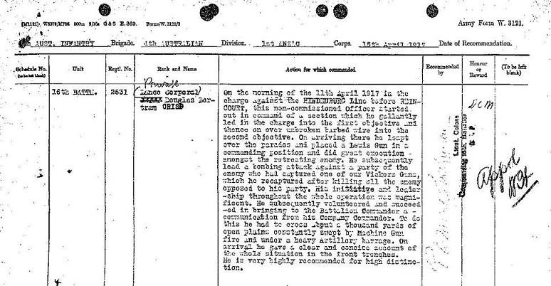 'On the morning of the 11th April 1917 in the charge against Hindenburg Line before Reincourt, this non-commissioned Officer started out in command of a section which he gallantly led in the charge into the first objective and thence on over unbroken barbed wire into the second objective. ON arriving there he leapt over the parados and placed a Lewis Gun in a commanding position and did great execution - amongst the retreating enemy. He subsequently lead a bombing attack against a part of the enemy who had captured one of our Vickers Guns, which he recaptured after killing all the enemy opposed to his part. His initiative and leadership throughout the whole operation was magnificent. He subsequently volunteered and succeeded in bringing to the Battalion Commander a communication from his company Commander. To do this he had to cross about a thousand yards of open plains constantly swept by Machine Gun fire and under a heavy Artillery barrage. On arrival he gave a clear and concise account of the whole situation in the front trenches. He is very highly recommened for high distinction.