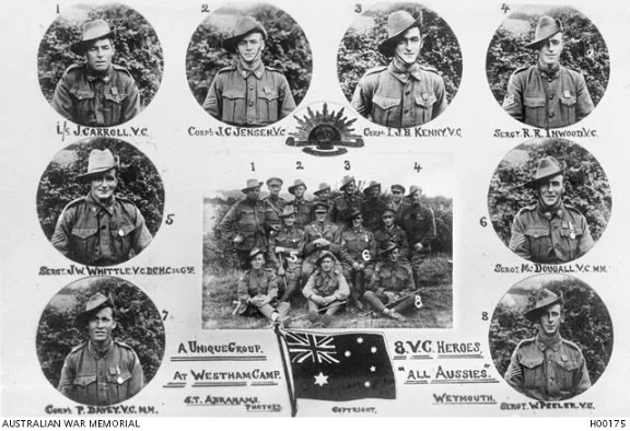 A montage of nine portrait photographs taken at Westham camp. In the centre is a group portrait of fifteen Australian soldiers and is surrounded by individual portraits of eight of the men who are in the group portrait all of whom had been awarded the Victoria Cross (VC). The central group portrait numbers correspond with the numbers around the edge of the photo. Identified left to right 1 Lance Corporal (L Cpl) John Carroll; 2 Corporal (Cpl) Jorgan Christian Jensen; 3 Cpl Thomas James Bede Kenny; 4 Sergeant (Sgt) Reginald Ray Inwood; 5 Sgt John Woods Whittle; 6 Sgt Stanley Robert McDougall; 7 Cpl Philip Davey; 8 Sgt Walter Peeler. The officer at middle row, second from left, is Major Elliot Frank Playford OBE, 43rd Battalion and Camp Commandant of Westham Camp.