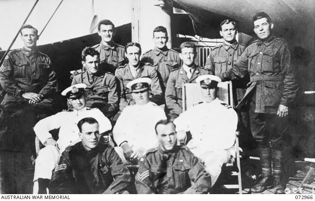 Port Melbourne, Vic. 1918. Australian Victoria Cross winners from World War 1 invited by the Prime Minister of Australia, The Honourable W. M. Hughes, to return home to assist in a recruiting campaign. The photograph was taken as the ship HMAT Medic was berthing. The identified men are, from the left; front row, 506 Sergeant R. R. Inwood, 10th Infantry Battalion; 4061 Sergeant S. R. McDougall, 48th Infantry Battalion; second row not identified; third row, 2060 Lieutenant J. J. Dwyer, 4th Machine Gun Company; 958 Lieutenant L. Keysor, 42nd Infantry Battalion; 1946 Lieutenant W. Ruthven, 22nd Infantry Battalion; back row, 114 Sergeant W. Peeler, 3rd Pioneer Battalion; 4195 Corporal T. J. B. Kenny, 2nd Infantry Battalion; 2902 Sergeant J. W. Whittle, 12th Infantry Battalion; 2389 Corporal J. C. Jensen, 50th Infantry Battalion; 1804 Private J. Carroll, 33rd Infantry Battalion.