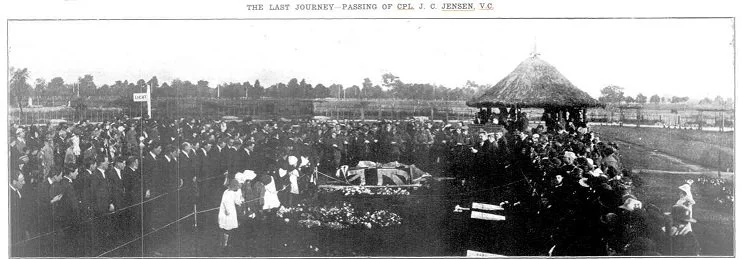 The path of glory leads but to the grave. But it ivas a splendid pathway along which Cpl. Jensen, V.C.— his gallant body enshrouded in the proudest flag of all, the Union Jack — passed on his final sad journey to his last resting place at the A.I.F. Cemetery, West terrace, on Friday afternoon. The sidewalks of Sturt street, which leads directly into the main gates of the cemetery, were thronged with people, who were anxious to pay their last respects to one of Australia's heroes, and the children of the Sturt Street Public School stood rank upon rank, silent- and bareheaded, in the brilliant sunshine. The cortege was long and impressive. The coffin, shrouded in the Union Jack, was borne upon a gun carriage, drawn by a splendid team of black horses, in charge of fully accoutred members of the A.S.C. On top of the coffin were the deceased's hat, belt, and medals. Marching four abreast immediately in the rear of the re- mains came hundreds of men who had served with Cpl. Jensen, and right in front was Mr. Sammy Lunn, bareheaded, and stepping out firmly with the rest. A long line of carriages brought up the rear of one of the most impressive funerals which have passed through the gates of the West Terrace Cemetery.