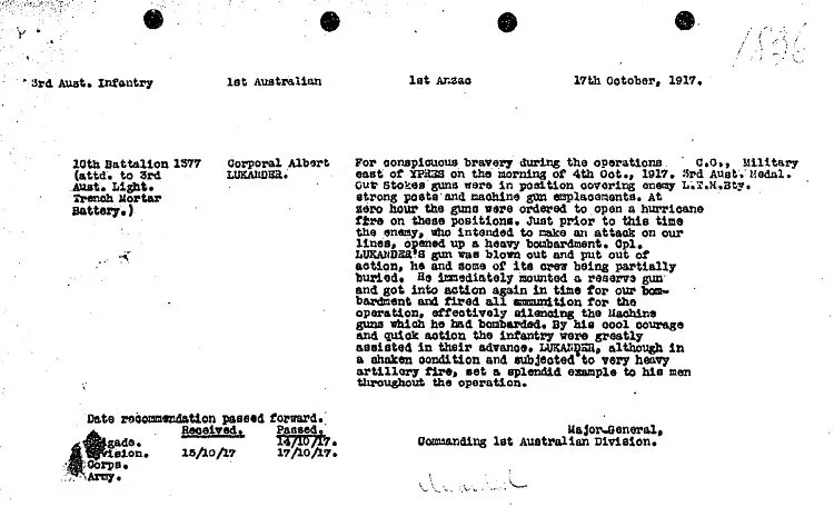 | 'For conspicuous bravery during the operations east of YPRES on the morning of 4th October, 1917. Our Stokes guns were in position covering enemy strong posts and machine gun emplacements. At zero hour the guns were ordered to open a hurricane fire on these positions. Just prior to this time the enemy, who intended to make an attack on our lines, opened up a heavy bombardment. Cpl. LUKANDER'S gun was blown out and put out of action, he and some of its crew being partially buried. He immediately mounted a reserve gun and got into action again in time for our bombardment and fired all ammunition for the operations, effectively silencing the Machine guns which he had bombarded. By his cool courage and quick action the infantry were greatly assisted in their advance. LUKANDER, although in a shaken condition and subjected to very heavy artillery fire, set a splendid example to his men throughout the operation.' | |