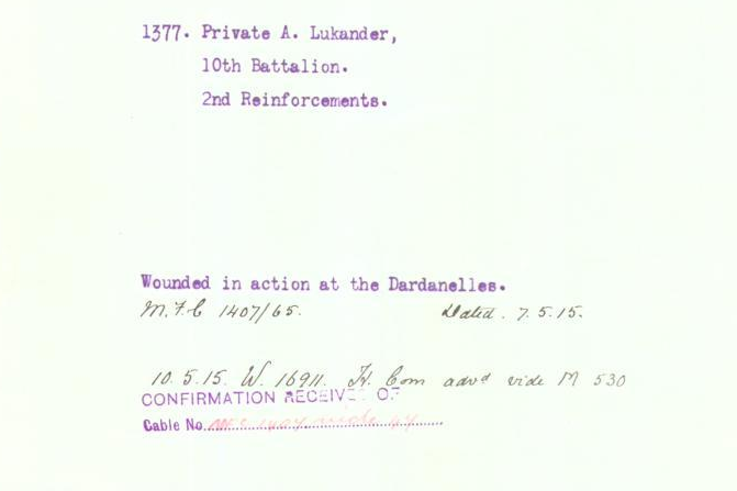 Corporal Albert Lukander 1377, a Sailor from, Birkenhead, Port Adelaide, South Australia, prior to enlistment 24 November 1914, he embarked with the 10th Battalion, 2nd Reinforcement from Melbourne, Victoria, on board HMAT A46 Clan Macgillivray on 2 February 1915.