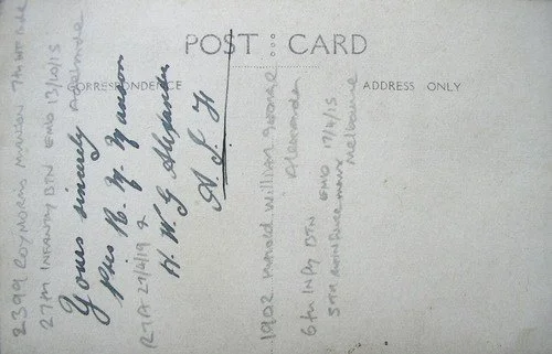 Private Roy Morris Manson 2399, a Labourer from Close Street, Semaphore, South Australia, prior to enlistment 23 June 1915 aged 24, he embarked with the 27th Battalion, 5th Reinforcement from Adelaide, South Australia, on board HMAT A32 Themistocles on 13 October 1915.