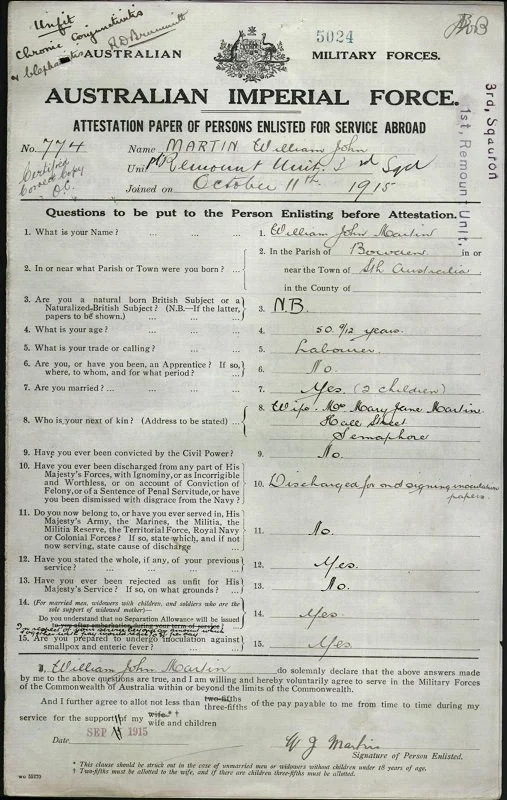 Private William John Martin 774, a Labourer from Hall Street, Semaphore, South Australia, prior to enlistment 11 October 1915 aged 50, he embarked with the Australian Remount Unit 1, Squadron 3 from Melbourne, Victoria, on board Transport A67 Orsova on 12 November 1915.
