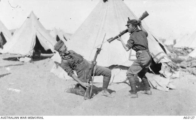 Private (Pte) L W Lee and Pte F J S Mead (later Captain, MC DCM) skylarking with bayonets outside a tent at the 10th Battalion camp at Mena. Australian troops trained at Mena before embarking for the Gallipoli Peninsula.