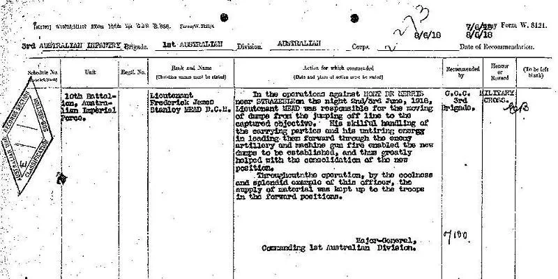 Captain Frederick James Stanley Mead 324, of the 10th Battalion from Semaphore, South Australia. A Wharf builder prior to enlisting on 19th August 1914, he embarked for overseas from Adelaide, South Australia, on board Transport A11 Ascanius on 20 October 1914. He was awarded a Distinguished Conduct Medal on 19 April 1917 and a Military Cross on 4 February 1919