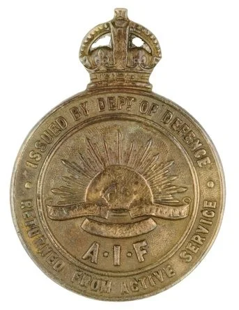 A Circular brass badge surmounted by a King's crown. In the centre is the AIF rising sun emblem surrounded by the text 'Issued by Dept. of Defence "Returned from Active Service". The reverse has been impressed with the the makers details and a number. These badges were issued to all soldiers and nurses who returned to Australia from active service and were discharged.