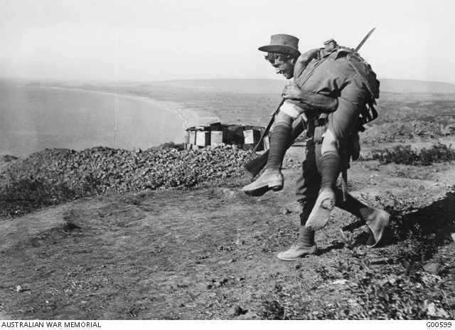 The original Admiralty caption to this photograph reads: "An Australian bringing in a wounded comrade to hospital. Notwithstanding the unhappy situation, they joked as they made their way down from the front." This photograph was stated by Charles Bean to have been staged by the photographer, and the following note was added to the caption: "The original Admiralty caption describes the re-enactment of an event frequently seen". In the distance can be seen North Beach, running north towards Suvla. The man carrying his comrade was identified in the 1920s as Lance Corporal C S Elliott, C Company, 2nd Battalion and has also been identified as 913 Private Frederick John Schenscher, 27th Battalion, who was awarded a DCM for rescuing wounded in France in 1917.