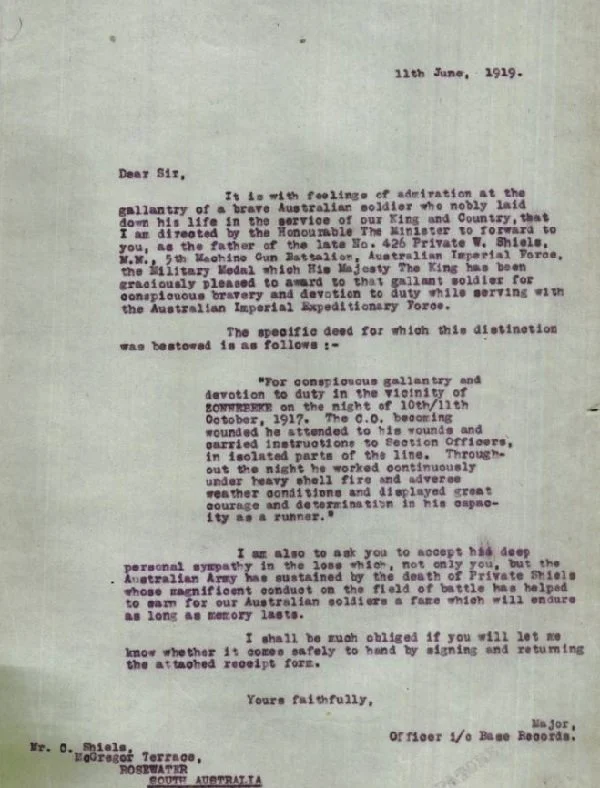 Walter Shiels was eligible to receive the 1914-15 Star, British War Medal and Victory Medal trio and was awarded a Millitary Medal. He did not live to receive his war medals however: his file shows that Base Records Melbourne sent the Millitary Medal to his Parents in July 1919. The British War Medal and Victory Medal would have been posted out in 1923.